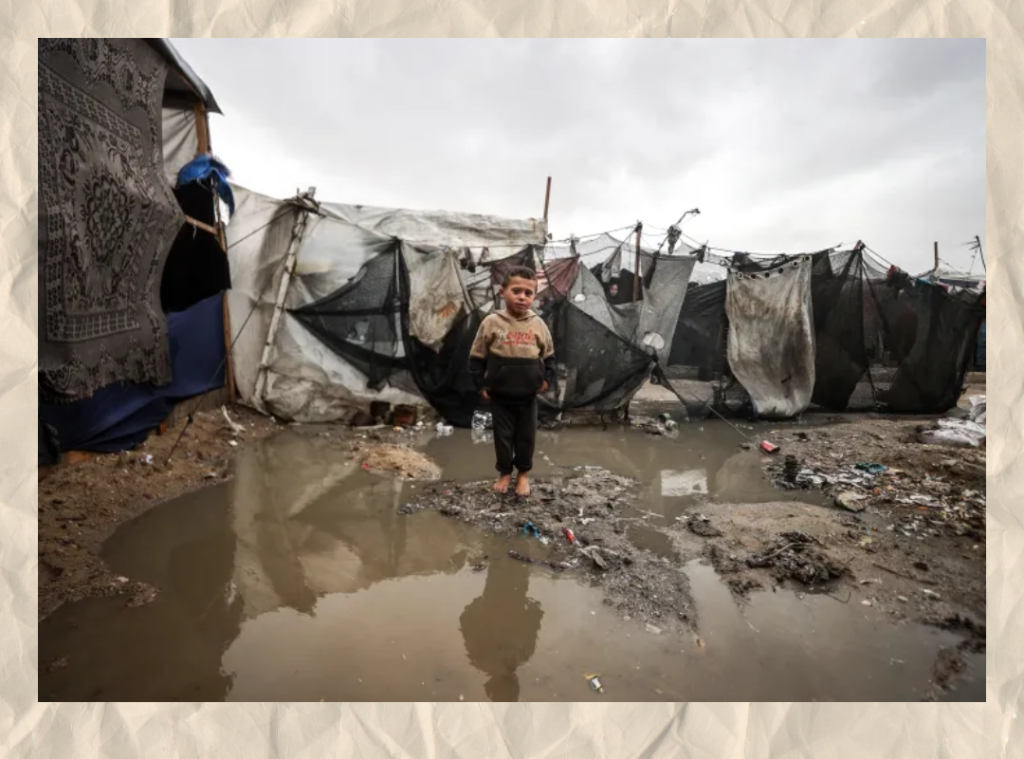 Displaced families in Gaza City’s makeshift camps are grappling with severe hardship from continuous heavy rains, which have intensified suffering in the war-ravaged enclave. The prolonged conflict has left infrastructure in ruins, and without prior warnings, even basic possessions have been ruined by the deluge. Beds, clothing, and essential items are completely drenched, forcing residents