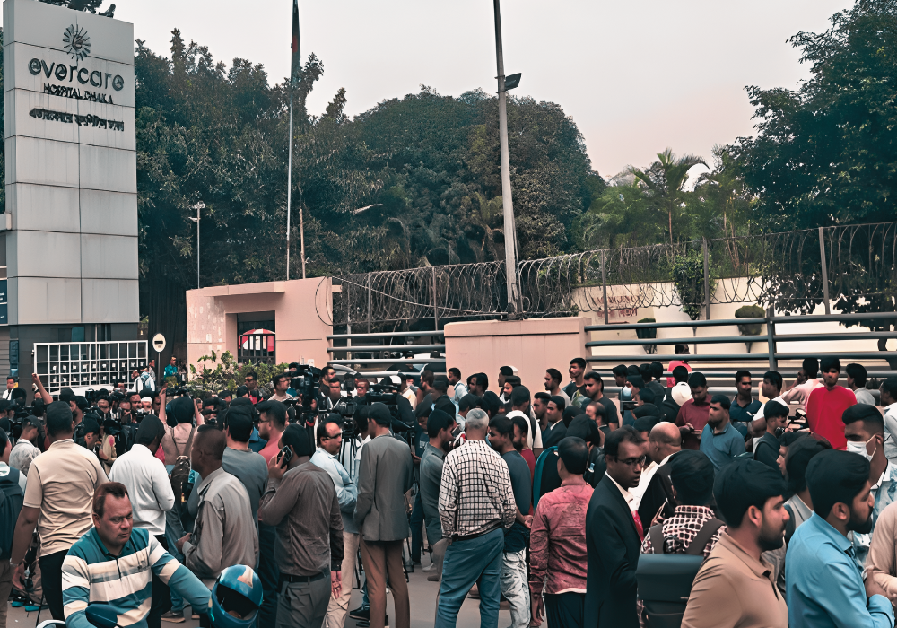 সাবেক প্রধানমন্ত্রী ও বিএনপি চেয়ারপারসন বেগম খালেদা জিয়াকে দেখতে দেশের বিভিন্ন জেলা থেকে দলীয় নেতাকর্মীরা রাজধানীর এভারকেয়ার হাসপাতালের সামনে ভিড় করেছেন। ধামরাই থেকে আসা মুদি ব্যবসায়ী ইব্রাহীম আলীসহ মুন্সিগঞ্জের রবিউল ইসলামের মতো অসংখ্য কর্মী প্রিয় নেত্রীর স্বাস্থ্যের খোঁজ নিতে এসেছেন। নেতাকর্মীদের এই ভিড়ের কারণে আইনশৃঙ্খলা নিয়ন্ত্রণে হাসপাতাল এলাকায় বিশেষ নিরাপত্তামূলক ব্যবস্থা গ্রহণ করা হয়েছে। স্পেশাল সিকিউরিটি ফোর্স (এসএসএফ), বর্ডার গার্ড বাংলাদেশ (বিজিবি) ও পুলিশসহ আইনশৃঙ্খলা রক্ষাকারী বাহিনী মোতায়েন করা হয়েছে এবং হাসপাতালের সামনের সড়কে কাঁটাতারের ব্যারিকেড দেওয়া হয়েছে। এদিকে, অধ্যাপক শাহাবুদ্দিন তালুকদারের নেতৃত্বাধীন দেশি-বিদেশি বিশেষজ্ঞদের মেডিকেল বোর্ডের অধীনে খালেদা জিয়ার চিকিৎসা কার্যক্রম চলছে এবং তাঁর শারীরিক অবস্থা আপাতত অপরিবর্তিত রয়েছে বলে জানা গেছে। এছাড়া, এসএসএফ প্রটোকল অনুযায়ী হাসপাতালের কাছের দুটি মাঠে সেনাবাহিনী ও বিমানবাহিনীর হেলিকপ্টারের পরীক্ষামূলক অবতরণ-উড্ডয়ন হবে বলে সরকারের পক্ষ থেকে জানানো হয়েছে