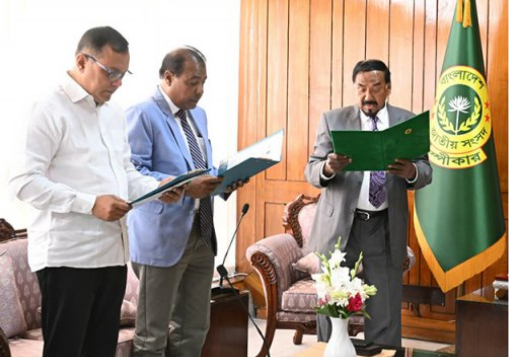 ত্রয়োদশ জাতীয় সংসদের নবনির্বাচিত দুইজন সংসদ সদস্যের শপথ গ্রহণ অনুষ্ঠান আজ রবিবার (১২ এপ্রিল, ২০২৬) দুপুরে জাতীয় সংসদ ভবনে সম্পন্ন হয়েছে। স্পিকার হাফিজ উদ্দিন আহমদ নবনির্বাচিত সংসদ সদস্য মাহমুদুল হক রুবেল (শেরপুর-৩) এবং রেজাউল করিম বাদশাকে (বগুড়া-৬) শপথবাক্য পাঠ করান। উল্লেখ্য, বগুড়া-৬ আসনে গত ১২ ফেব্রুয়ারি অনুষ্ঠিত সাধারণ নির্বাচনে জয়ী হয়েছিলেন বিএনপি চেয়ারম্যান তারেক রহমান; পরবর্তীতে তিনি আসনটি ছেড়ে দিলে গত ৯ এপ্রিল সেখানে উপনির্বাচন অনুষ্ঠিত হয়। অন্যদিকে, শেরপুর-৩ আসনে নির্বাচনের আগে এক প্রার্থীর মৃত্যুজনিত কারণে ভোট স্থগিত হওয়ায় একই দিনে সেখানেও পুনরায় নির্বাচন অনুষ্ঠিত হয়। শপথ গ্রহণ শেষে প্রথা অনুযায়ী দুই সংসদ সদস্যই শপথ বইয়ে স্বাক্ষর করেন এবং জাতীয় সংসদের কার্যক্রমে আনুষ্ঠানিকভাবে যোগ দেন। সংসদ সচিবালয়ের ঊর্ধ্বতন কর্মকর্তাবৃন্দ এই শপথ অনুষ্ঠানে উপস্থিত ছিলেন।
